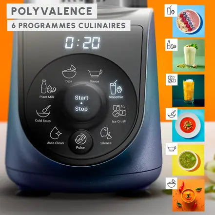 Blender polyvalent avec 8 programmes automatiques garantissant une vitesse et un temps de mixage optimal, pour des textures parfaites sur toutes les recettes